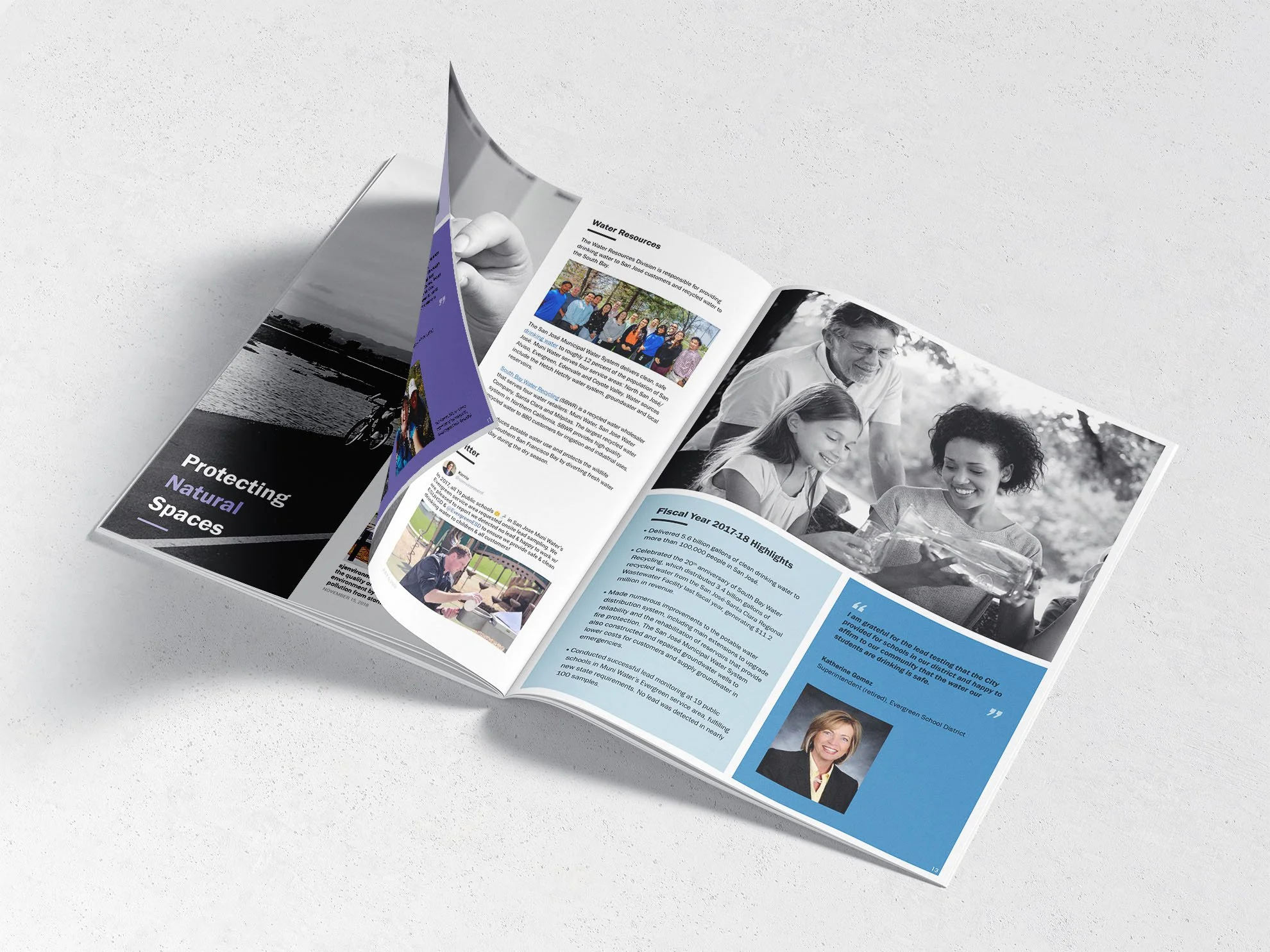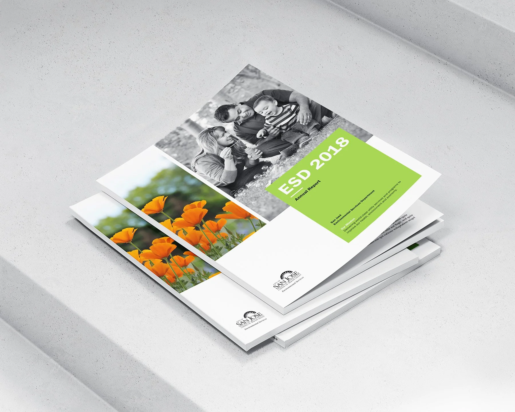 Annual Report Design for the Environmental Services Department of San Jose featuring all departments and their efforts throughout the year.